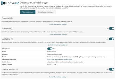 - Einfach Einbindung deiner verschiedenen Cookies (Facebook Pixel, Google Analytics, AdSense, etc.).Beispiele: Facebook Pixel DSGVO konform einbinden
